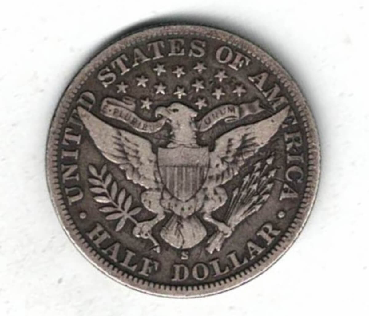 1900 S USA Barber Silver Half Dollar Coin. The reverse features a heraldic eagle with 13 stars above with the denomination below.1900 S USA Barber Silver Half Dollar Coin