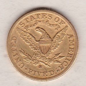 The 1900 S gold five dollar coin, also known as the half eagle. The coin features a Liberty head design (also know as the Coronet head) with the year-date below. The coin also has 13 stars around the perimeter. This obverse design was created by Christian Gobrecht and remained in use until 1908, when it was replaced by Bela Lyon Pratt’s Indian Head. The reverse is completed with an eagle and denomination below. The coin also includes the arms of the United States, the country name above the arms, and a motto in a ribbon. In all but the first year of issue, a mint mark is placed on the reverse below the eagle and above the word “FIVE”.