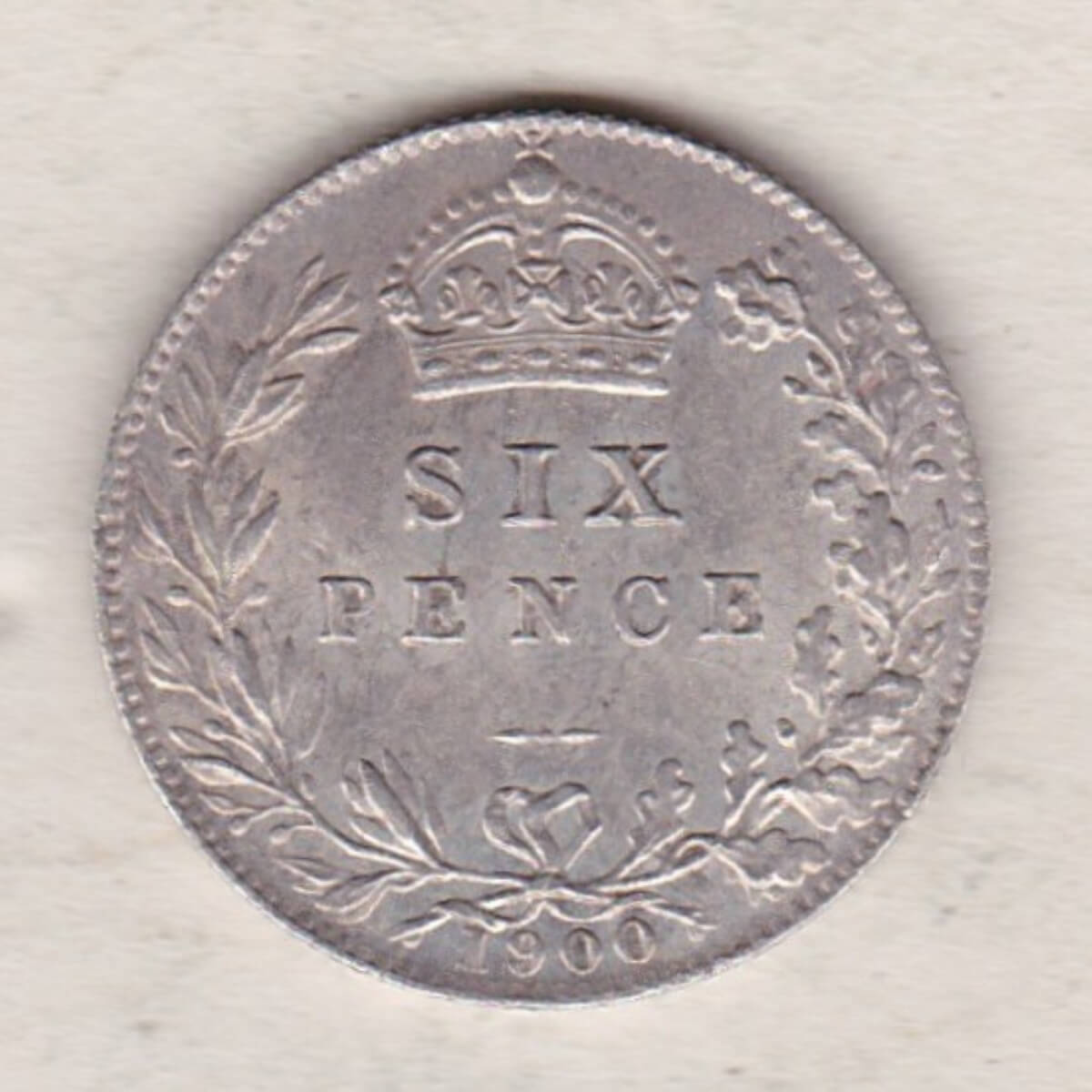 1900 Silver Sixpence coin featuring Queen Victoria on the Obverse. The Reverse features a crowned denomination within wreath.1900 Silver Sixpence – Victoria Old Head