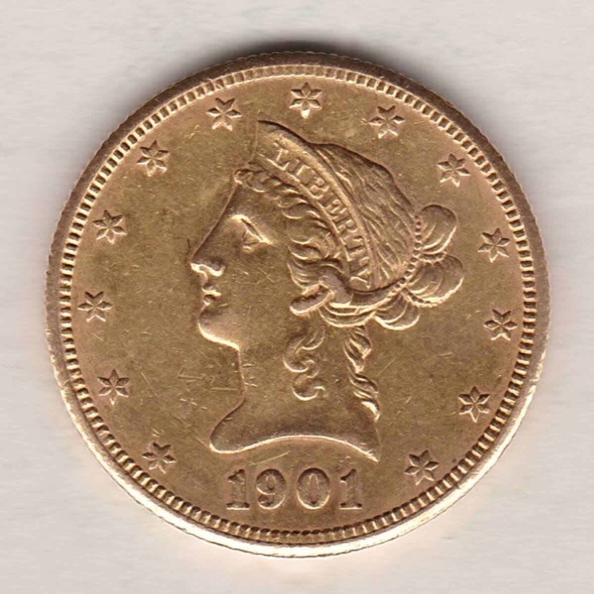 The 1901 gold ten dollar coin was minted in San Francisco. Christian Gobrecht designed both the obverse and reverse. The obverse features a bust of Liberty surrounded by 13 stars and the date below the neck. The reverse depicts an eagle holding arrows and an olive branch, with the inscriptions “UNITED STATES OF AMERICA” and “TEN D” surrounding it. A scroll above the eagle’s head displays a new motto.