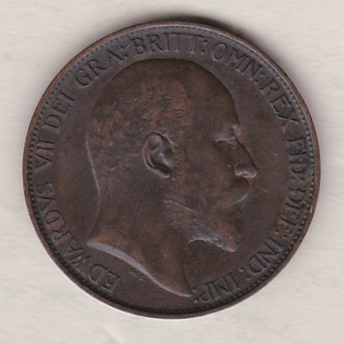 The 1902 halfpenny was struck in bronze by the Royal Mint. The obverse side of the coin depicts the uncrowned portrait of King Edward VII facing right, with legend around. The reverse side of the coin depicts Britannia seated to the right, the denomination around, with date in exergue, and sea behind.