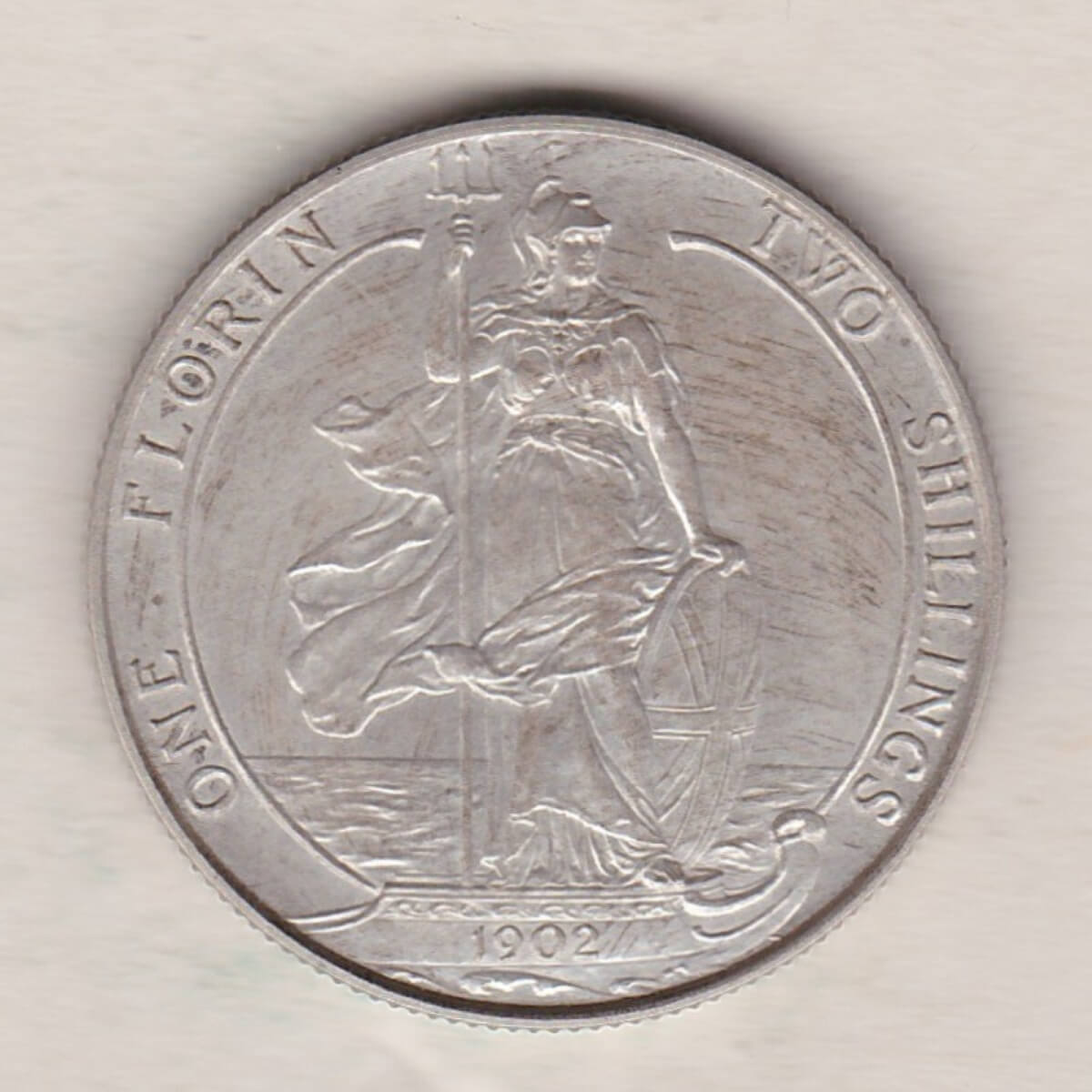 The 1902 silver Florin is a coin struck in 0.925 silver by the Royal Mint. There is an uncrowned portrait of King Edward VII facing right, on the obverse, with legend around. The reverse is completed with a standing figure of Britannia on ship’s bow holding trident in the right hand and shield bearing the Union flag in the left, with legend around, and date below.