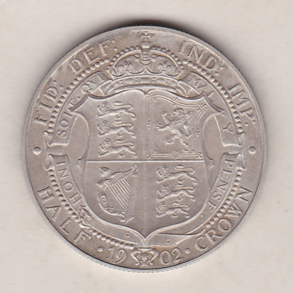 The 1902 Halfrown is a coin struck in 0.925 silver by the Royal Mint. There is an uncrowned portrait of King Edward VII facing right with the legend around. The Reverse features a crowned quartered shield of arms within a French garter with the motto *HONI SOIT. QVI MAL. Y PENSE.*. The date is located on either side of the garter buckle at the bottom, with HALF to the left and CROWN to the right.