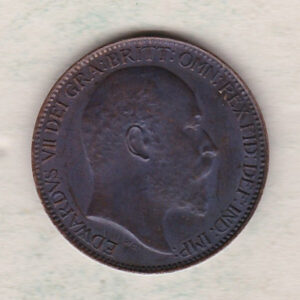 The 1903 farthing was struck in bronze by the Royal Mint. The obverse side of the coin features the uncrowned portrait of King Edward VII facing right, with legend around. The reverse features the seated figure of Britannia facing right, trident in left hand, shield with Union flag in right, the denomination above, and sea behind, with date in exergue.