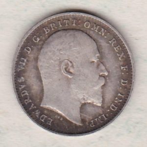1904 Silver Threepence coin featuring the portrait of King Edward VII on the Obverse. The Reverse features a crowned denomination dividing the date.1904 Silver Threepence – Edward VII