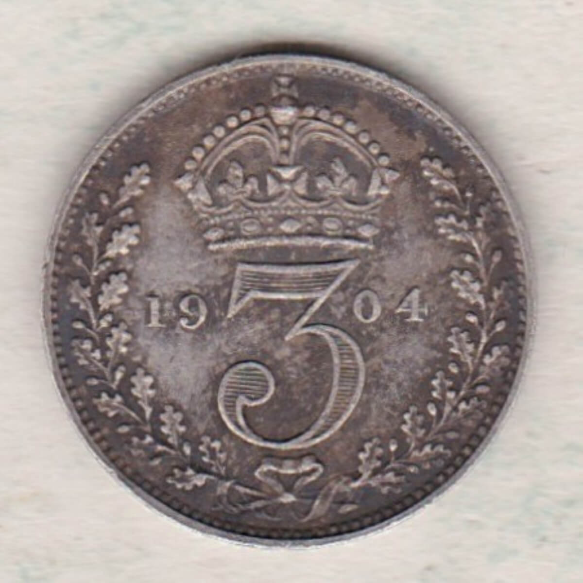 The 1904 Threepence is a coin struck in 0.925 silver by the Royal Mint.  There is an uncrowned portrait of King Edward VII facing right with the legend around.  The Reverse features a crowned denomination dividing the date, all within an oak wreath.