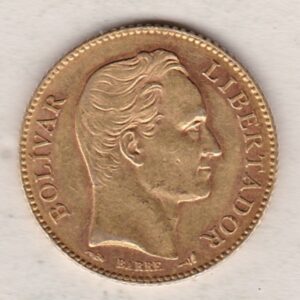 The Twenty Bolivares is a gold coin struck in Paris, France. The obverse features Bolivar’s bust facing to the right, flanked by legend. The name of the engraver and secret symbol bellow. The reverse features the coat of arms with legend at the top. The weight, date and fineness at the bottom.