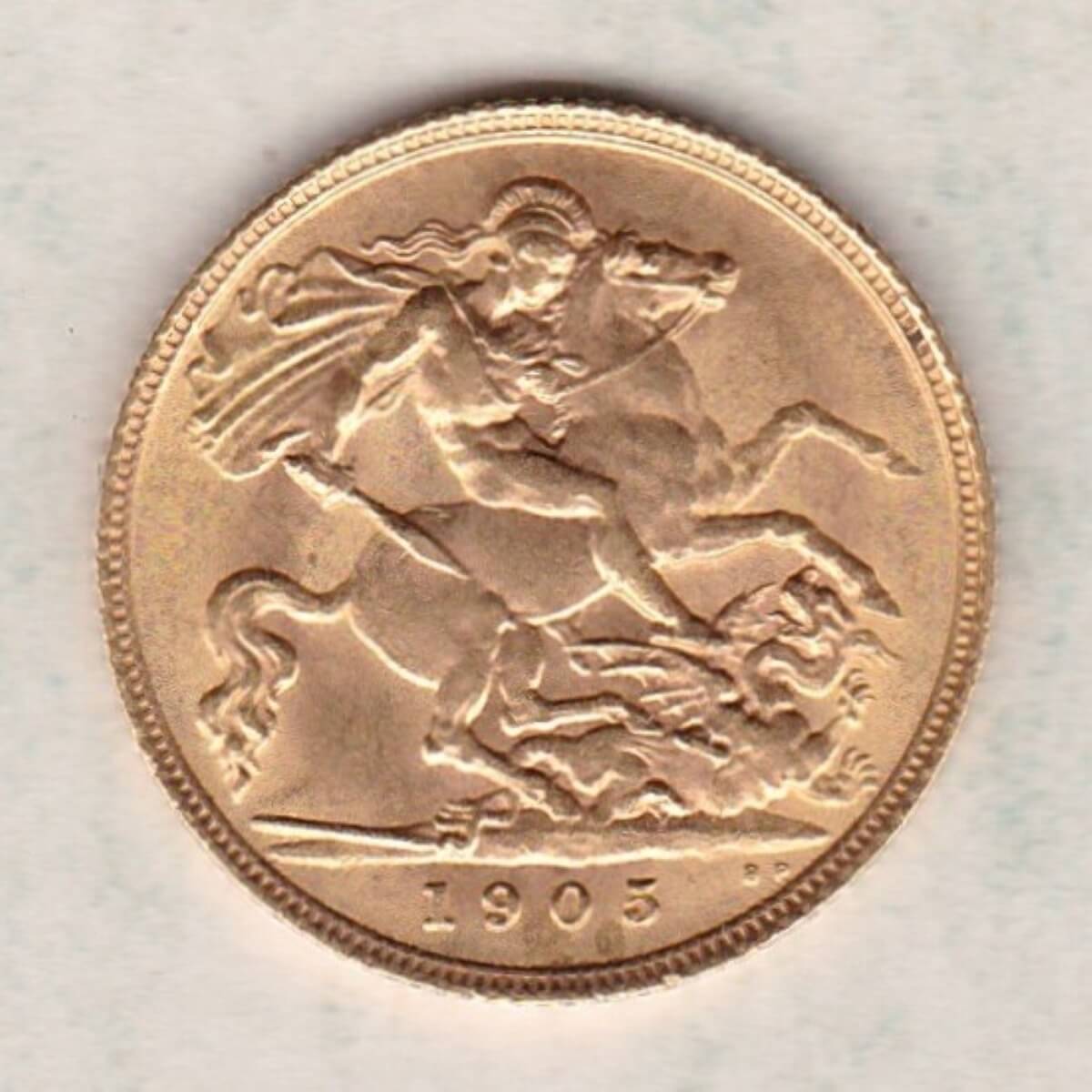 The 1905 half sovereign is a coin struck in 22 carat gold by the Royal Mint.  The obverse of this coin features the uncrowned portrait of King Edward VII facing right, with legend around. The reverse depicts St. George slaying the dragon, with the date and designer’s initials in exergue.