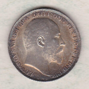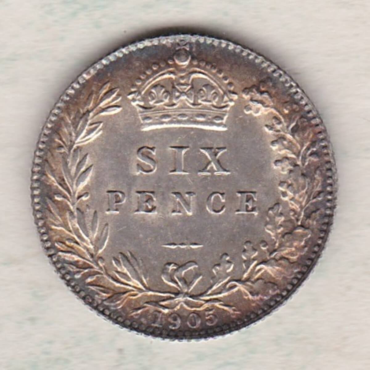 The 1905 Sixpence is a coin struck in 0.925 silver by the Royal Mint. This coin features the uncrowned portrait of King Edward VII facing right, with legend around. The reverse features a crowned denomination within wreath (olive sprig on left, oak on right), with date below.