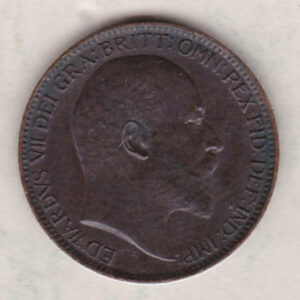 The 1906 farthing was struck in bronze by the Royal Mint. The obverse side of the coin features the uncrowned portrait of King Edward VII facing right, with legend around. The reverse features the seated figure of Britannia facing right, trident in left hand, shield with Union flag in right, the denomination above, and sea behind, with date in exergue.