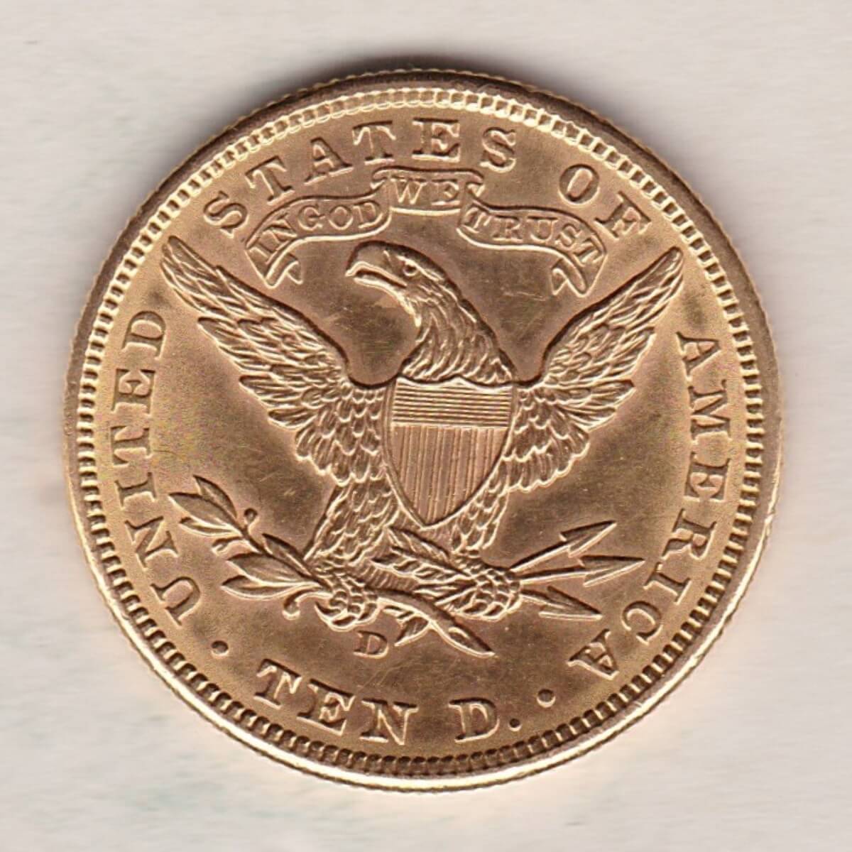 1906 D USA Ten Dollars coin featuring the bust of Liberty surrounded by 13 stars on the Obverse and the eagle on an olive branch on the Reverse.1906 D USA Ten Dollars Gold Coin