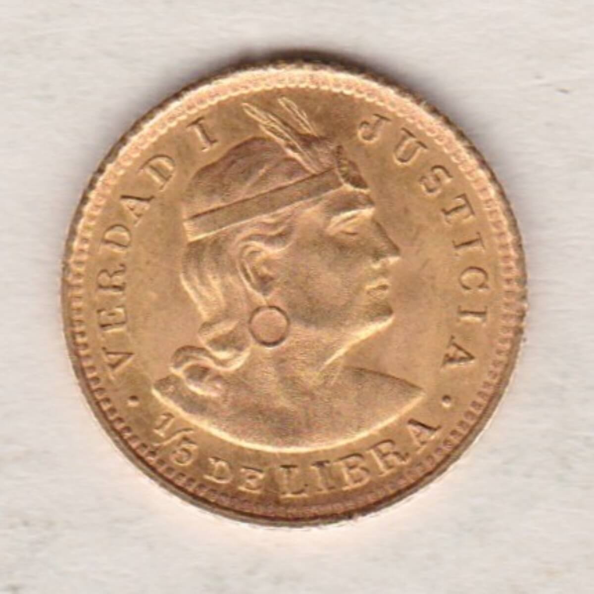 The gold 1/5th Libra is a gold coin struck in Lima, Peru as trade coinage. The obverse features a wreath around a radiant sun above a shield. The reverse features the right facing portrait.