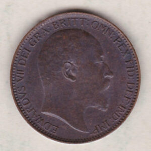 The 1907 farthing was struck in bronze by the Royal Mint. The obverse side of the coin features the uncrowned portrait of King Edward VII facing right, with legend around. The reverse features the seated figure of Britannia facing right, trident in left hand, shield with Union flag in right, the denomination above, and sea behind, with date in exergue.