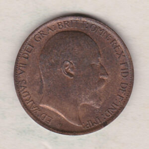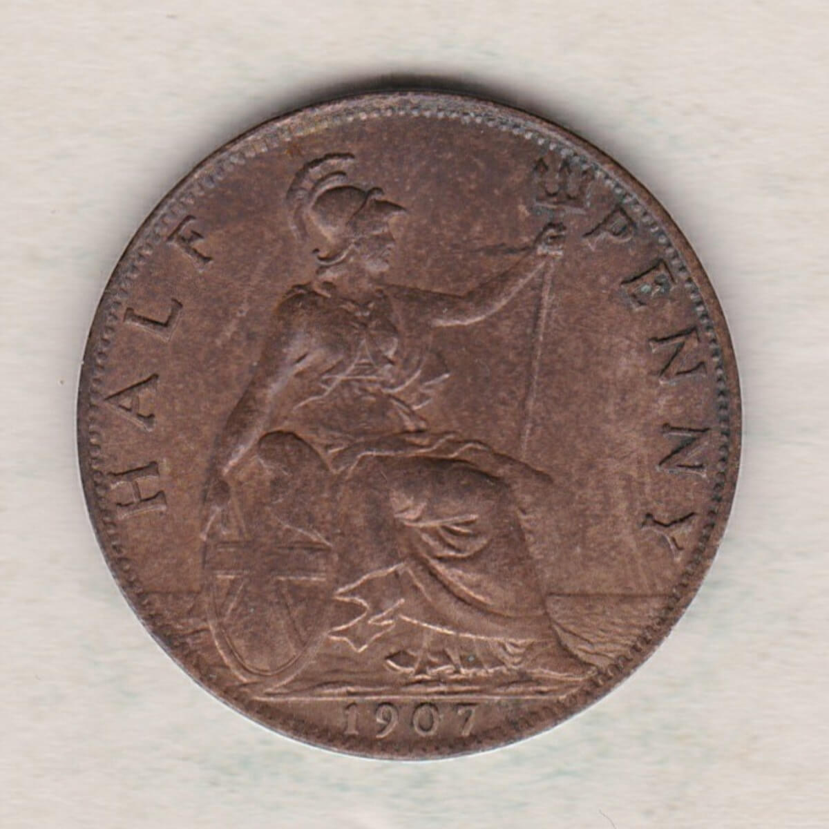 The 1907 halfpenny was struck in bronze by the Royal Mint. The obverse side of the coin depicts the uncrowned portrait of King Edward VII facing right, with legend around. The reverse side of the coin depicts Britannia seated to the right, the denomination around, with date in exergue, and sea behind.