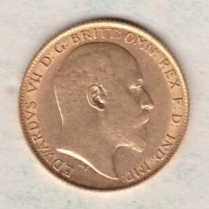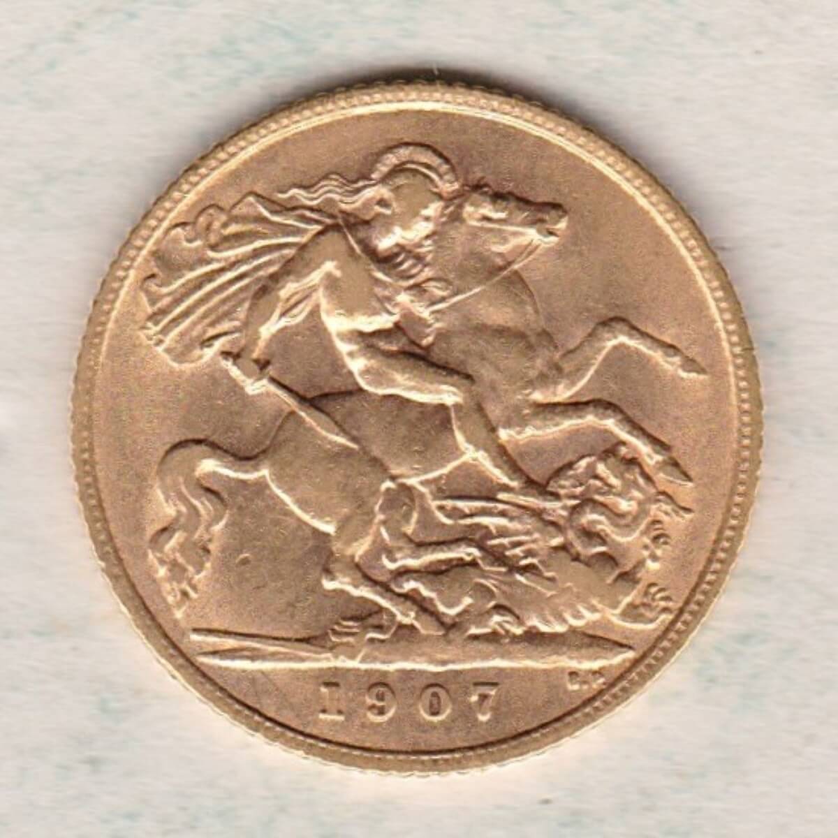 The 1907 half sovereign is a coin struck in 22 carat gold by the Royal Mint. The obverse of this coin features the uncrowned portrait of King Edward VII facing right, with legend around. The reverse depicts St. George slaying the dragon, with the date and designer’s initials in exergue.