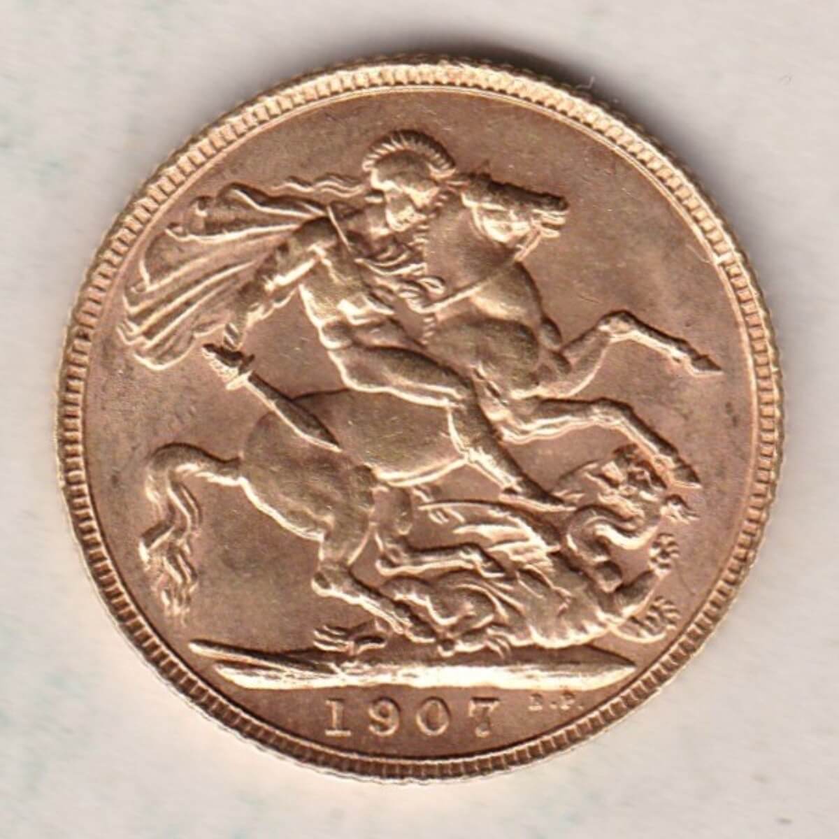 1907 Gold Sovereign Coin. The coin features King Edward VII on the Obverse. St George and the dragon on the reverse. London Mint.1907 Gold Sovereign – Edward VII