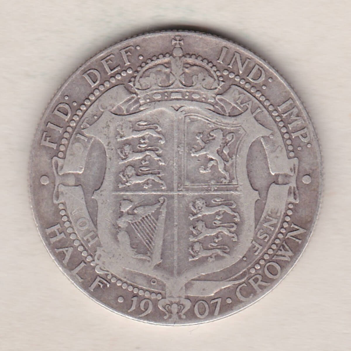 The 1907 Halfrown is a coin struck in 0.925 silver by the Royal Mint. There is an uncrowned portrait of King Edward VII facing right with the legend around. The Reverse features a crowned quartered shield of arms within a French garter with the motto *HONI SOIT. QVI MAL. Y PENSE.*. The date is located on either side of the garter buckle at the bottom, with HALF to the left and CROWN to the right.