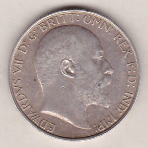 The 1908 silver Florin is a coin struck in 0.925 silver by the Royal Mint. There is an uncrowned portrait of King Edward VII facing right, on the obverse, with legend around. The reverse is completed with a standing figure of Britannia on ship’s bow holding trident in the right hand and shield bearing the Union flag in the left, with legend around, and date below.