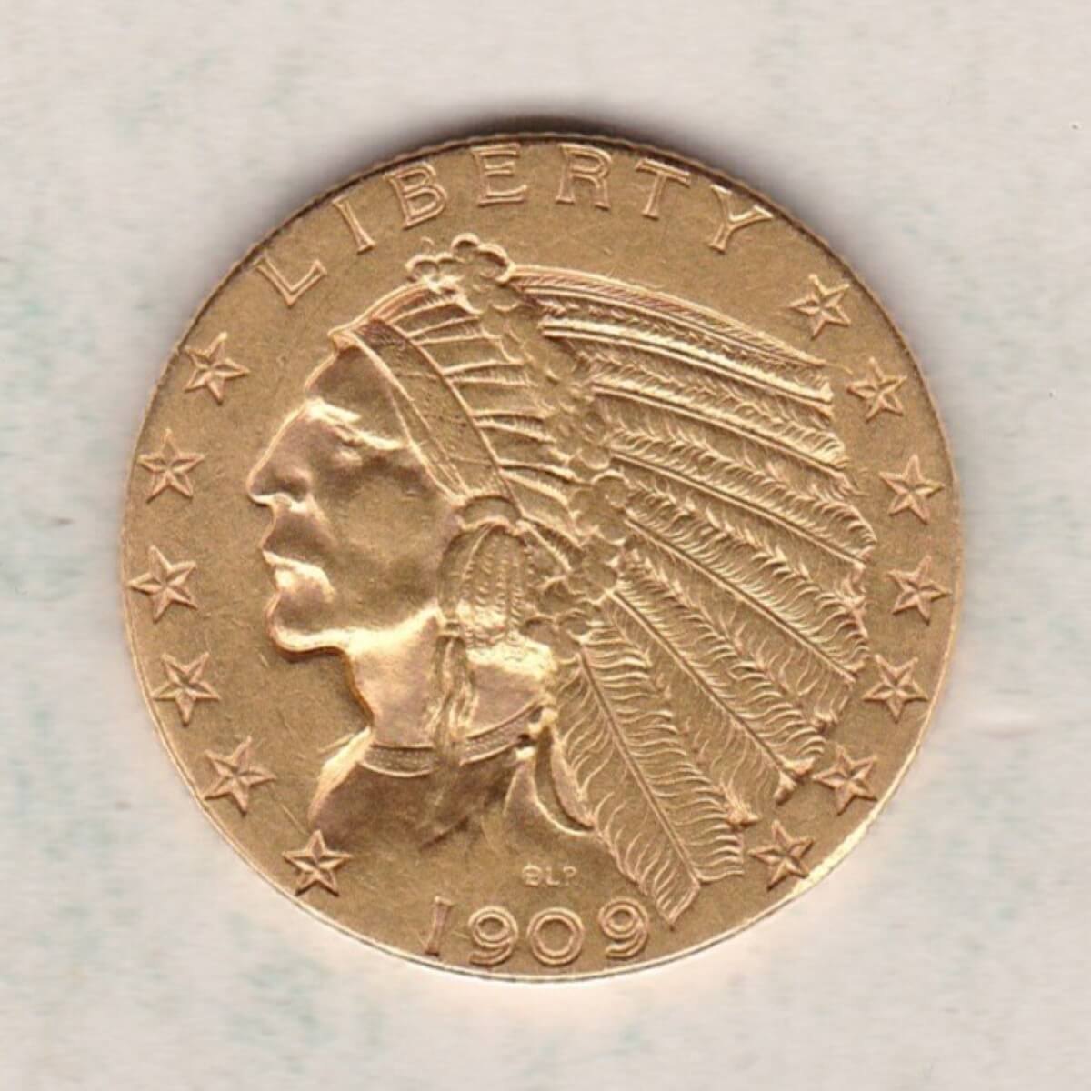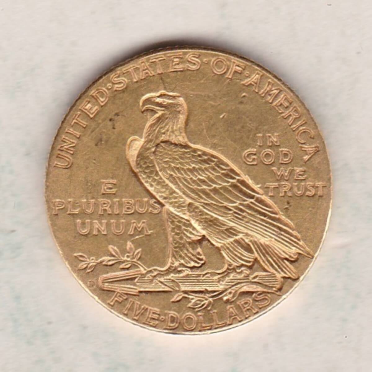 1909 D USA Five Dollars coin featuring D Denver mint mark, the Indian head design on the Obverse. The eagle on the Reverse.1909 D USA Five Dollars Gold Coin