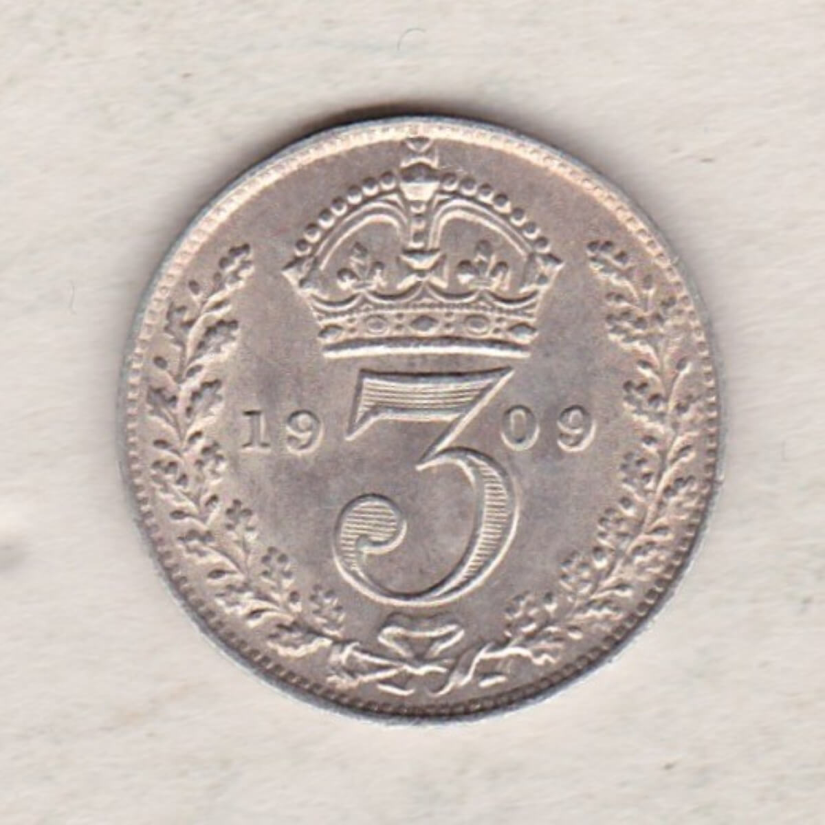 The 1909 Threepence is a coin struck in 0.925 silver by the Royal Mint. There is an uncrowned portrait of King Edward VII facing right with the legend around. The Reverse features a crowned denomination dividing the date, all within an oak wreath.