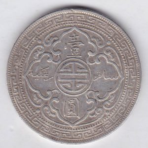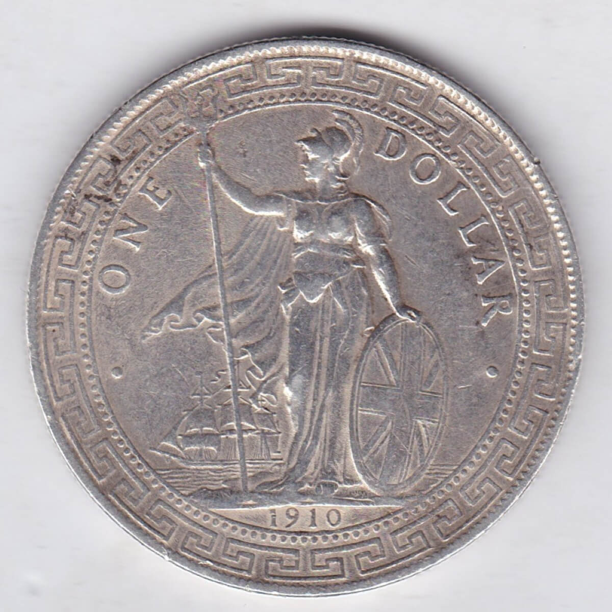 1910 B British Trade Dollar silver coin. The obverse features Britannia with a merchant ship in background. The reverse features Chinese characters.1910 B British Trade Dollar