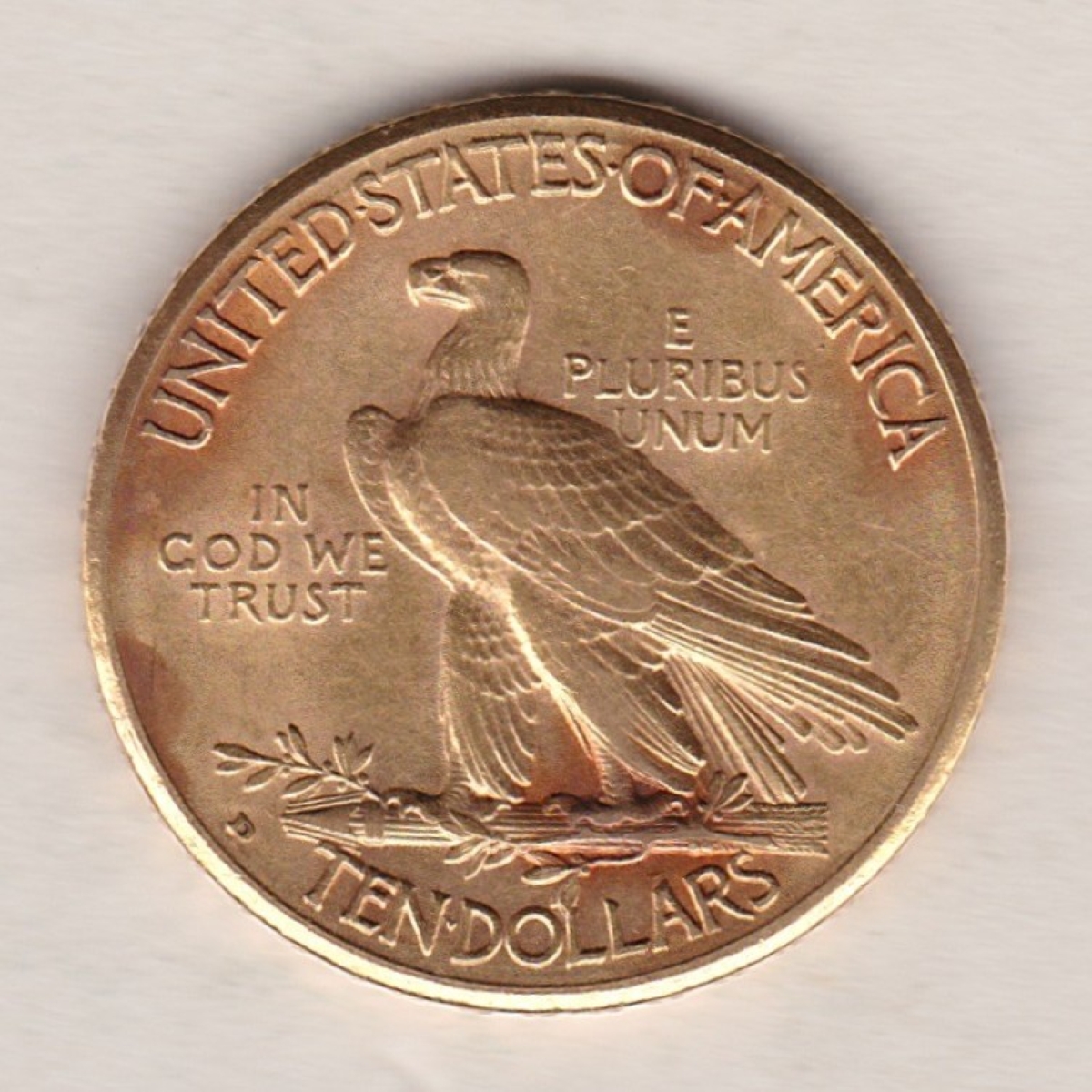 The 1910 gold ten dollar coin was minted in Denver, USA. The obverse features the Indian head capped with a feathered headdress, the date below, with 13 stars above. The reverse features an eagle facing left on a bundle of arrows with olive twigs, motto to left.
