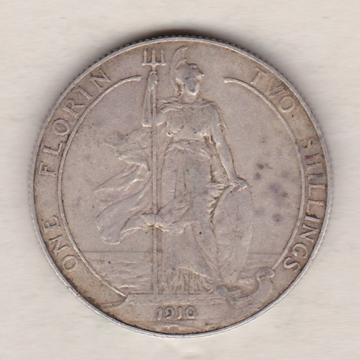 The 1910 silver Florin is a coin struck in 0.925 silver by the Royal Mint. There is an uncrowned portrait of King Edward VII facing right, on the obverse, with legend around. The reverse is completed with a standing figure of Britannia on ship’s bow holding trident in the right hand and shield bearing the Union flag in the left, with legend around, and date below.