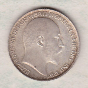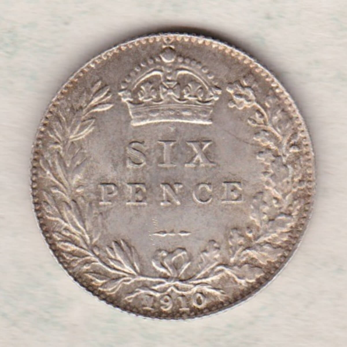 The 1910 Sixpence is a coin struck in 0.925 silver by the Royal Mint. This coin features the uncrowned portrait of King Edward VII facing right, with legend around. The reverse features a crowned denomination within wreath (olive sprig on left, oak on right), with date below.