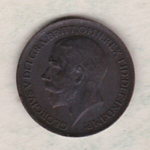 1911 bronze farthing coin featuring King George V on the obverse. The reverse features Britannia with the denomination above and date below.1911 Bronze Farthing – George V