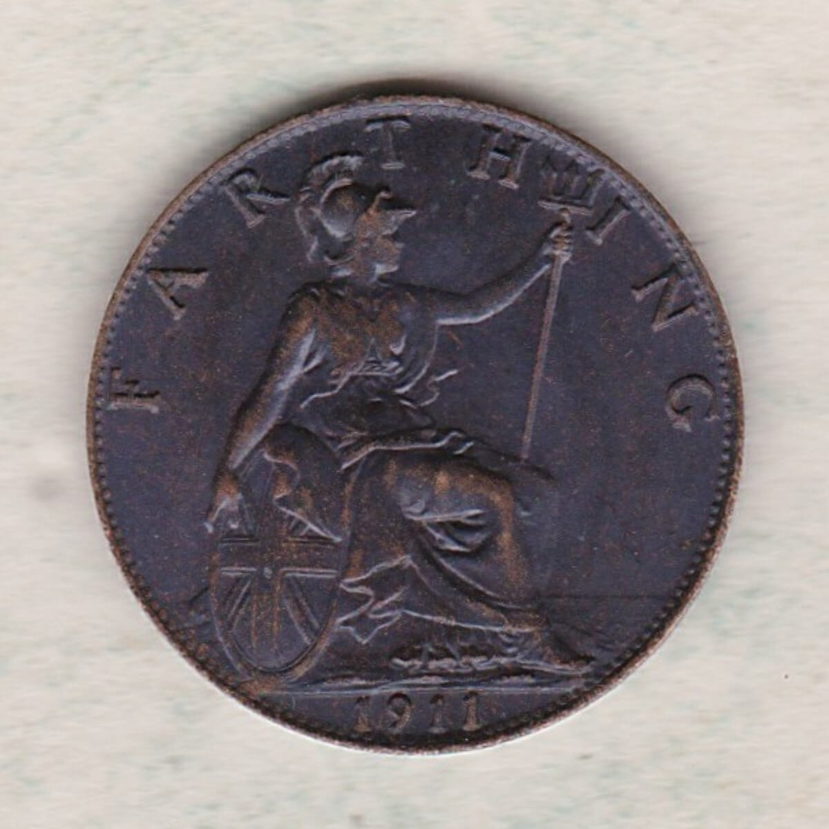 The 1911 farthing was struck in bronze by the Royal Mint. The obverse side of the coin features the uncrowned portrait of King George V facing left, with legend around. The reverse features the seated figure of Britannia facing right, trident in left hand, shield with Union flag in right, the denomination above, and sea behind, with date in exergue.