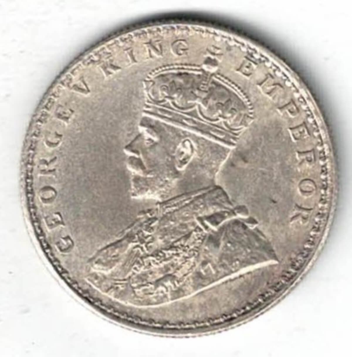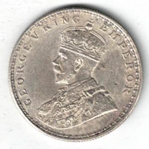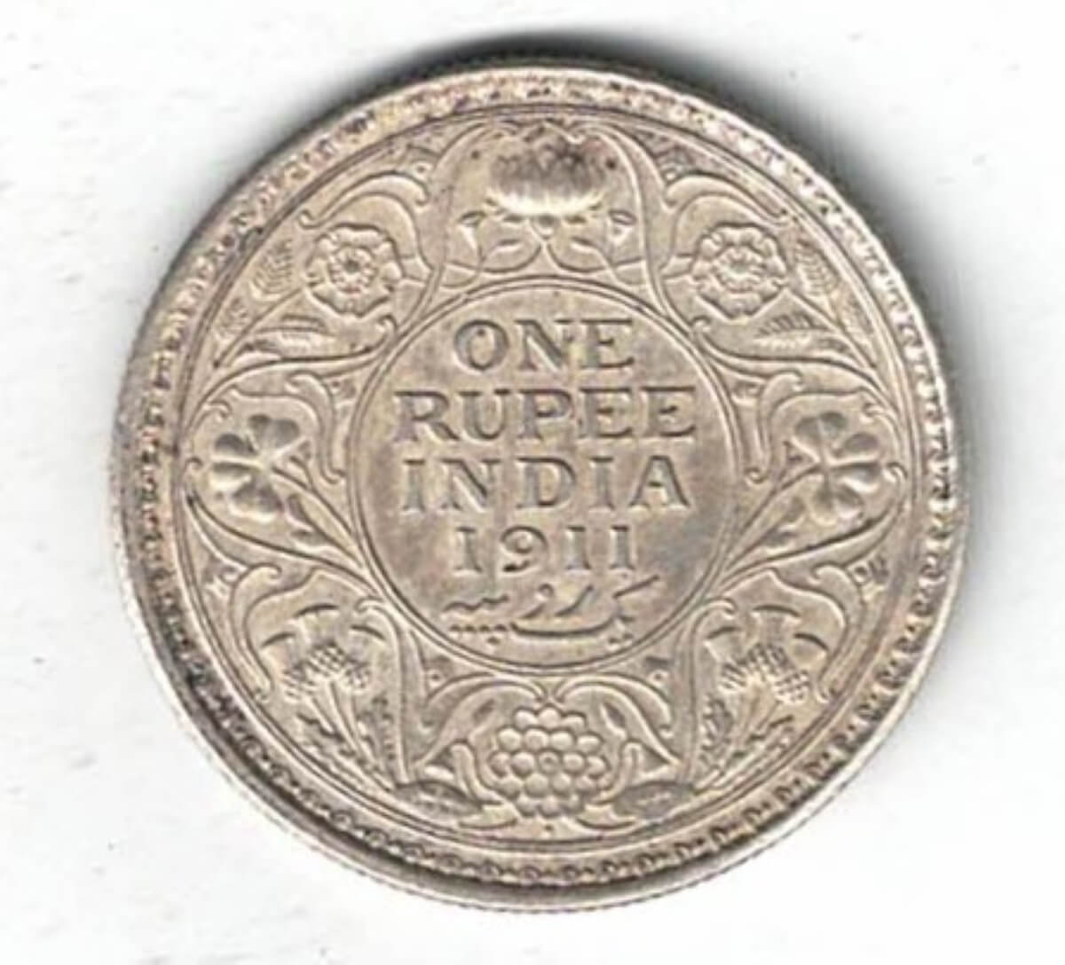 The 1911 One Rupee is a coin struck in .917 silver in Bombay, India. The obverse side of this coin features the bust of George V facing left. The reverse has the denomination and date within circle, with the outside of the circle having a wreath made of flowers.