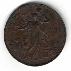 The 1911 Ten Centesimi is a coin struck in copper in Italy. The obverse of this coin features the head of Victtorio Emmanuel II facing left. The reverse features  two standing figures in field.