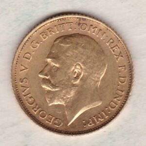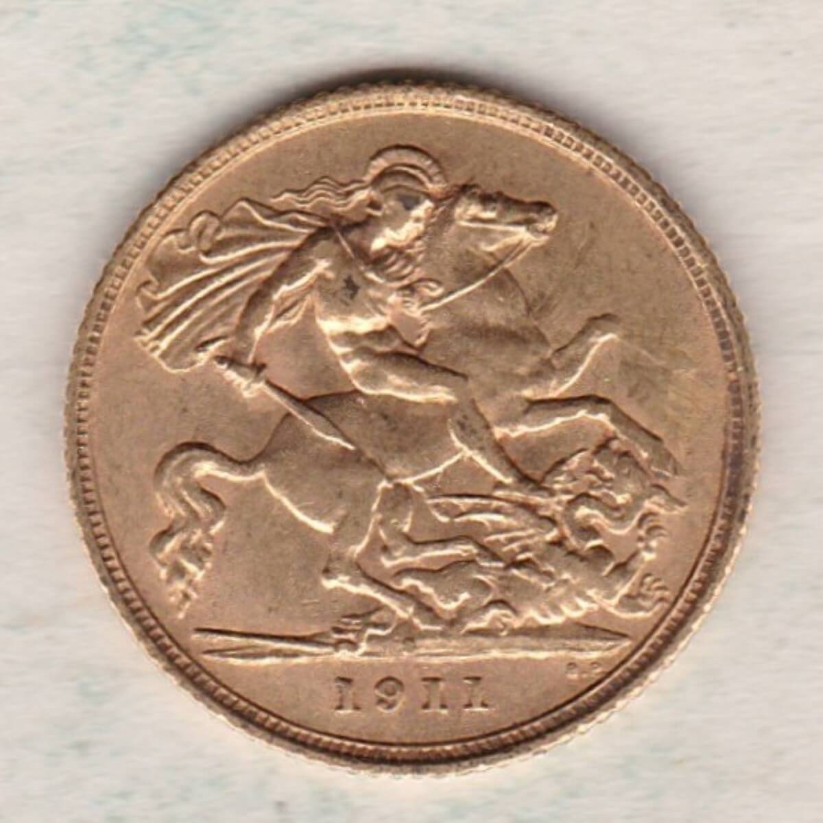 The 1911 half sovereign is a coin struck in 22 carat gold in Sydney, Australia. The obverse of this coin features the uncrowned portrait of King George V facing left, with legend around. The reverse depicts St. George slaying the dragon, with the date and designer’s initials in exergue. The S mintmark can be seen below the horse’s hooves.