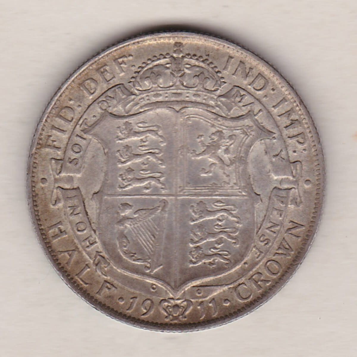 The 1911 Halfrown is a coin struck in 0.925 silver by the Royal Mint. There is a bare head design of George V on the Obverse. The Reverse features a crowned quartered shield of arms within a French garter with the motto *HONI SOIT. QVI MAL. Y PENSE.*. The date is located on either side of the garter buckle at the bottom, with HALF to the left and CROWN to the right.