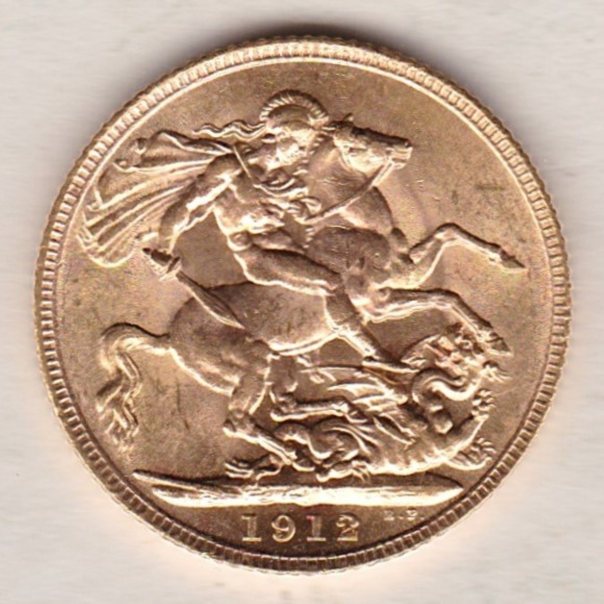 This 1912 sovereign is a coin struck in 22 carat gold by the Royal Mint.  The obverse of this coin features the uncrowned portrait of King George V facing left, with legend around. The reverse depicts St. George slaying the dragon, with the date and designer’s initials in exergue.