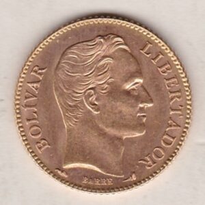The Twenty Bolivares is a gold coin struck in Paris, France. The obverse features Bolivar’s bust facing to the right, flanked by legend. The name of the engraver and secret symbol bellow. The reverse features the coat of arms with legend at the top. The weight, date and fineness at the bottom.