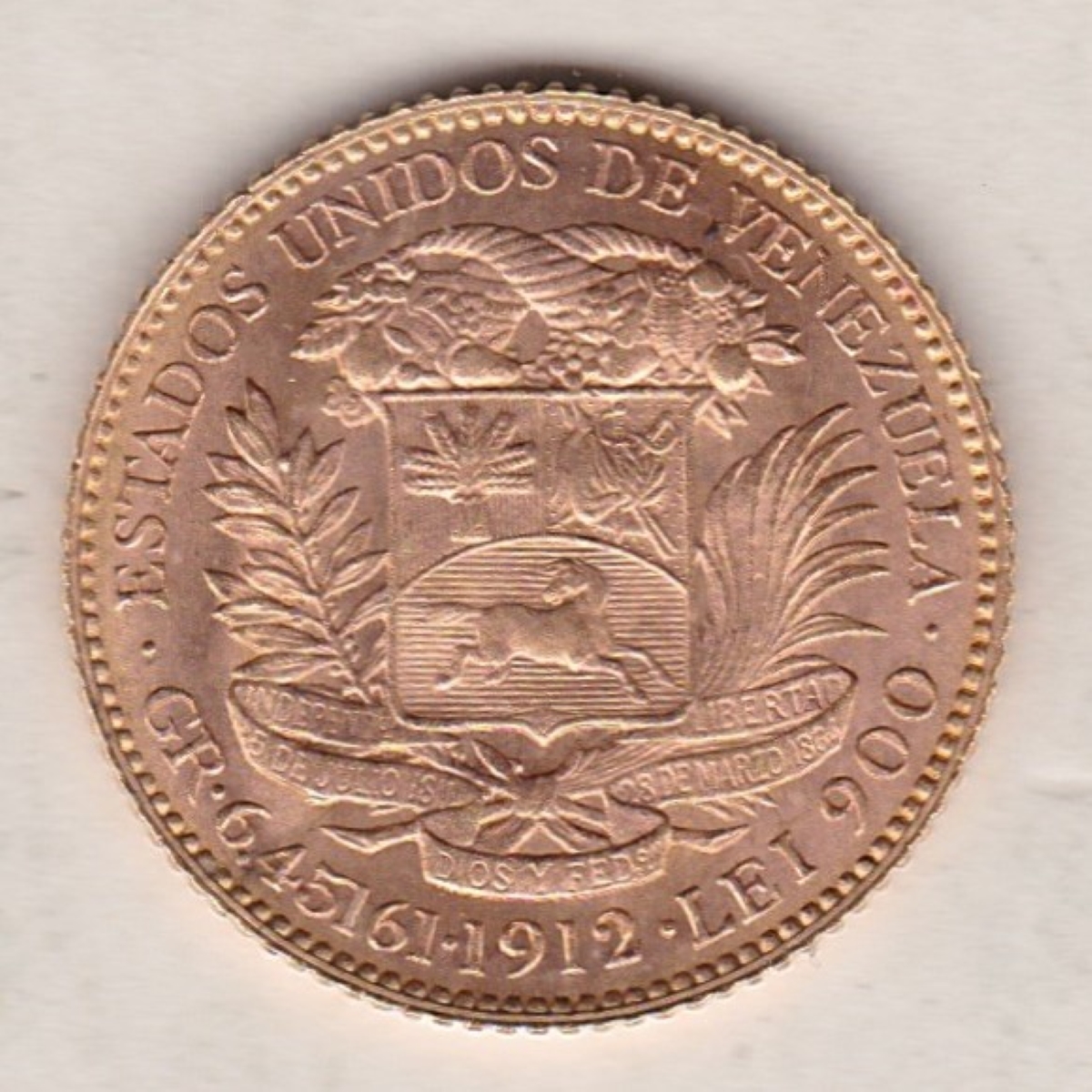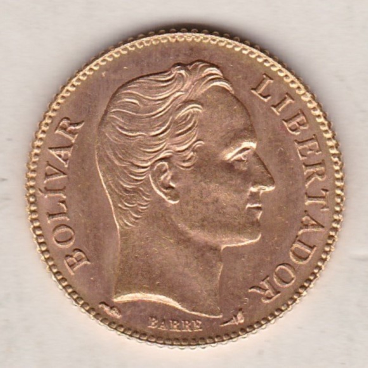 The Twenty Bolivares coin was struck in 0.900 Gold and weighs approx. 6.45 grams.