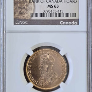 This 1913 Ten Dollars was struck in 0.900 gold by the Royal Canadian Mint in Ottawa. The obverse features a portrait of crowned portrait of King George V facing left. The reverse features the Canada coats of arms as given by Queen Victoria on May 26, 1868. They lie on top of 2 crossed maple branches. The date and denomination below.