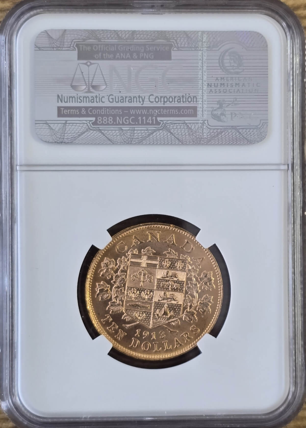 1913 Canada Gold Ten Dollars Coin. The obverse features King George V facing left. The reverse features the Canada coats of arms.1913 Canada Gold Ten Dollars MS63