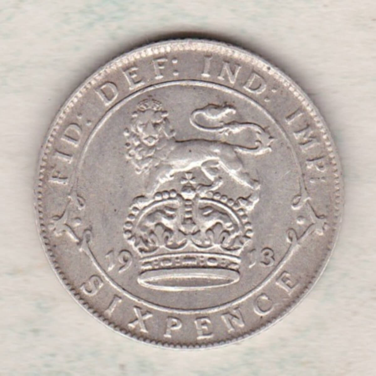 The 1913 Sixpence is a coin struck in 0.925 silver by the Royal Mint. This coin features the uncrowned portrait of King George V facing left, with legend around. The reverse features a crowned lion passant atop crown dividing date within circle, with legend above, and denomination below.