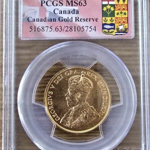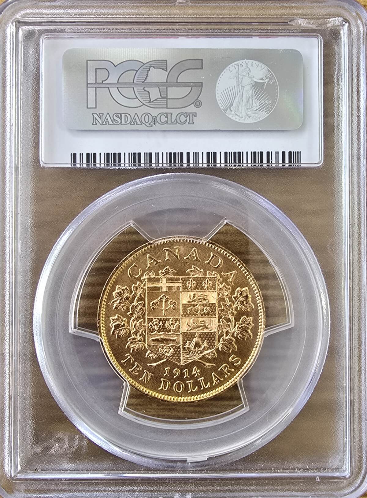 This 1914 Ten Dollars was struck in 0.900 gold by the Royal Canadian Mint in Ottawa. The obverse features a portrait of crowned portrait of King George V facing left. The reverse features the Canada coats of arms as given by Queen Victoria on May 26, 1868. They lie on top of 2 crossed maple branches. The date and denomination below.