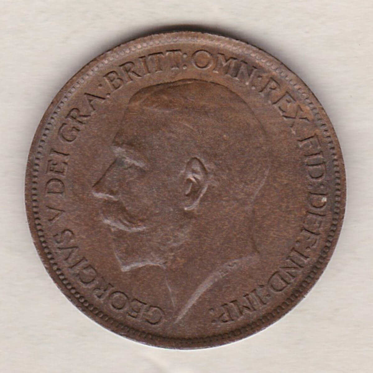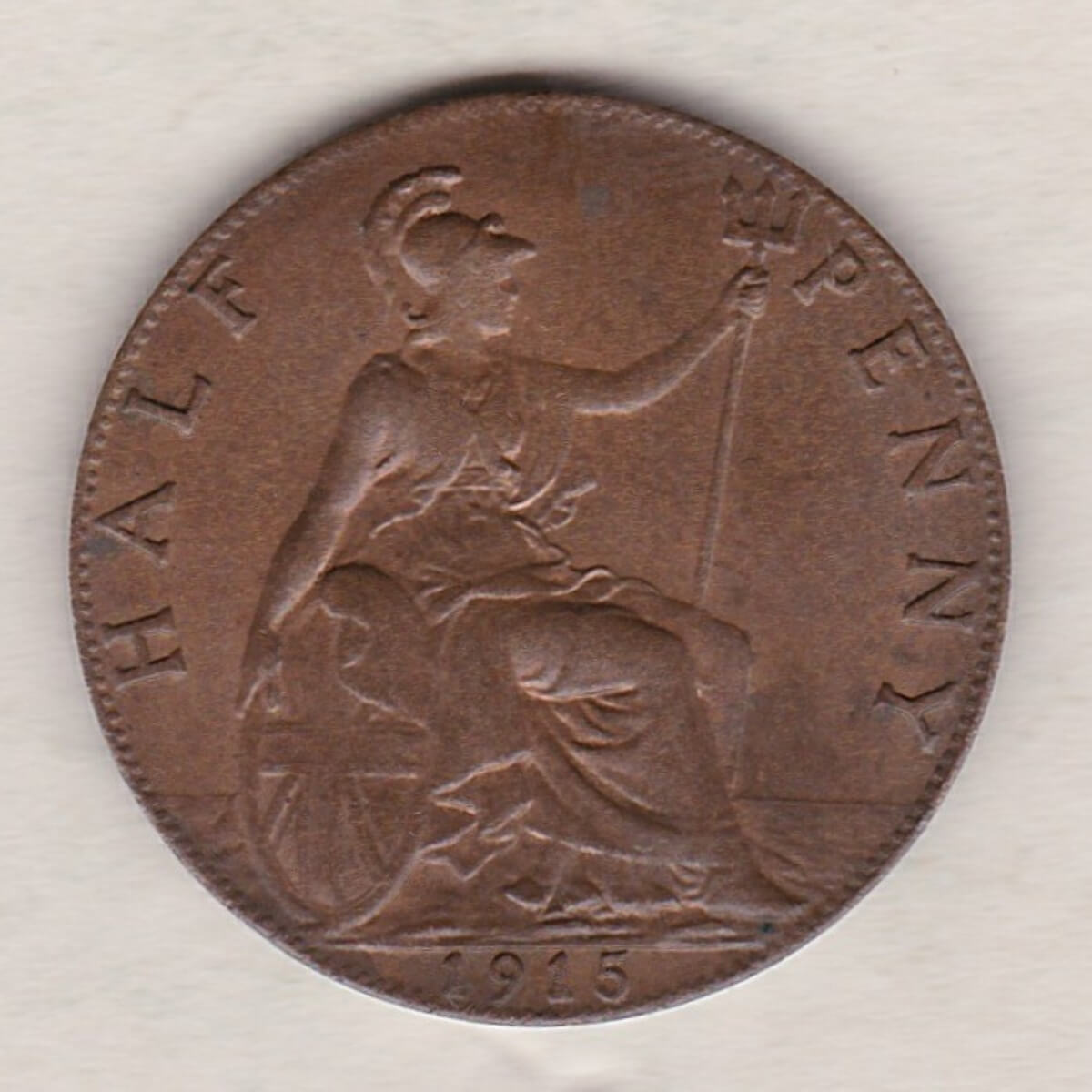 The 1915 halfpenny was struck in bronze by the Royal Mint. The obverse side of the coin depicts the uncrowned portrait of King George V facing left, with legend around. The reverse side of the coin depicts Britannia seated to the right, the denomination around, date in exergue, with sea behind.