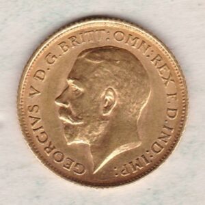 The 1915 half sovereign is a coin struck in 22 carat gold in Sydney, Australia.  The obverse of this coin features the uncrowned portrait of King George V facing left, with legend around. The reverse depicts St. George slaying the dragon, with the date and designer’s initials in exergue. The S mintmark can be seen below the horse’s hooves.