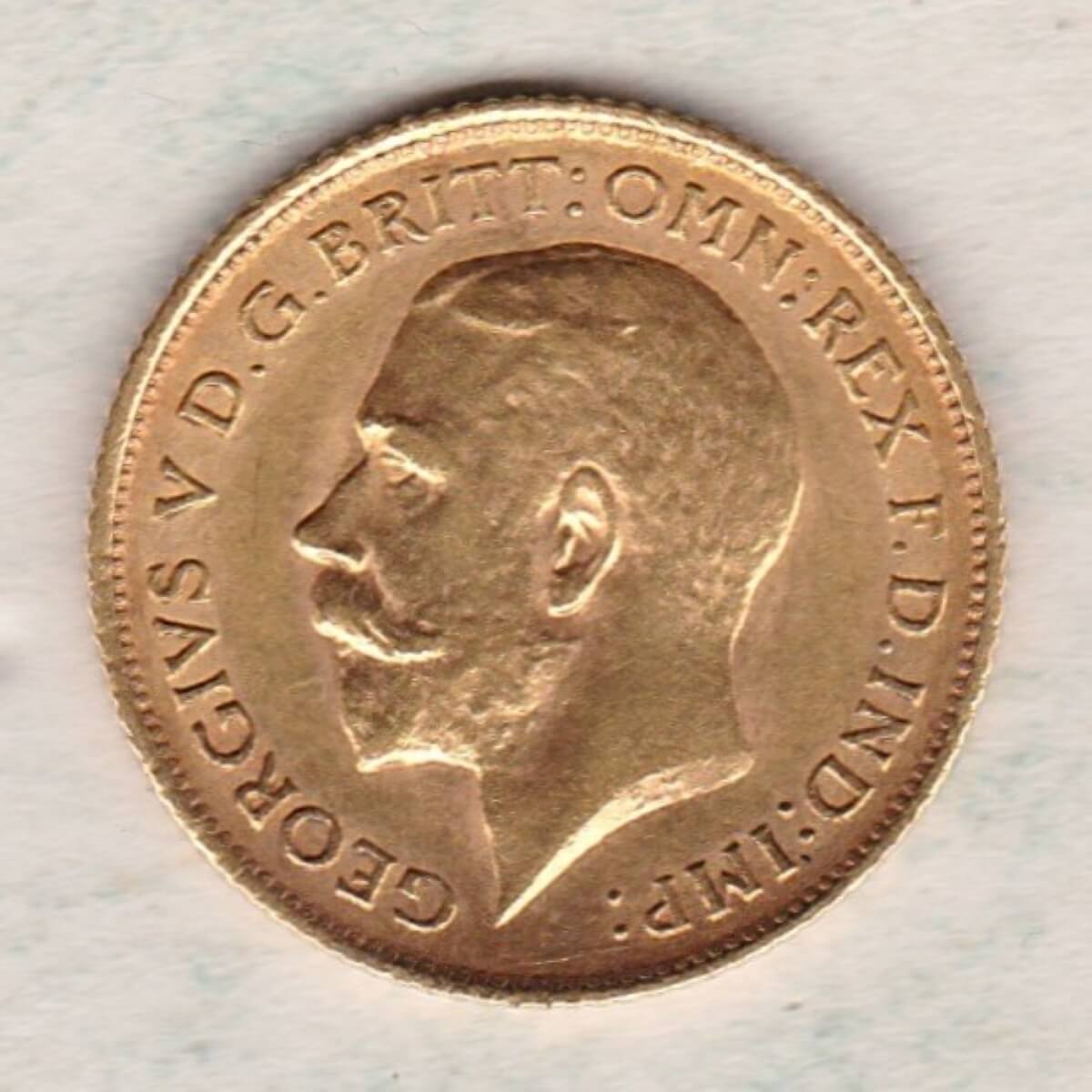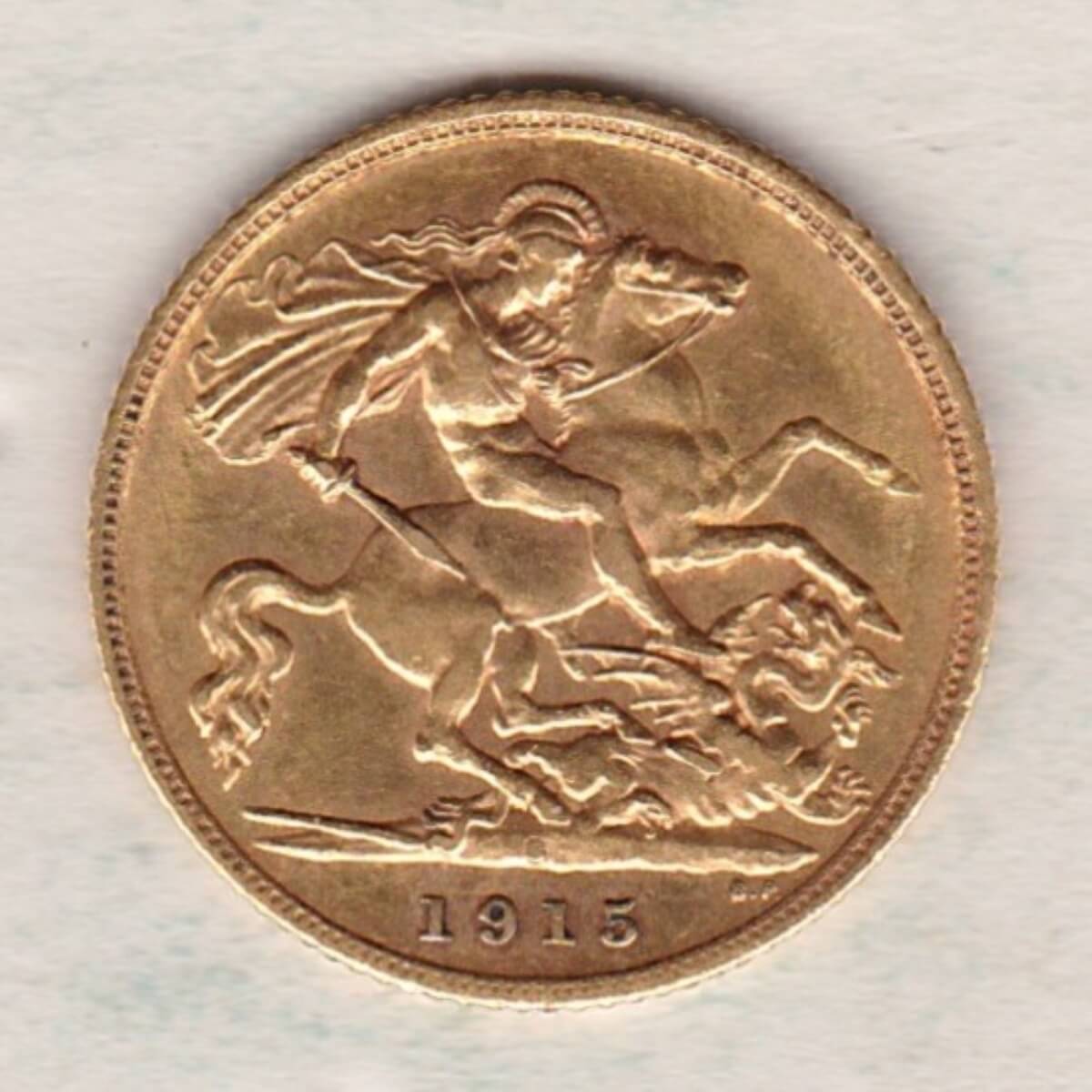 1915 S Gold Half Sovereign coin featuring the fourth portrait of King George V on the Obverse. St George and the dragon on the Reverse.1915 S Gold Half Sovereign – George V