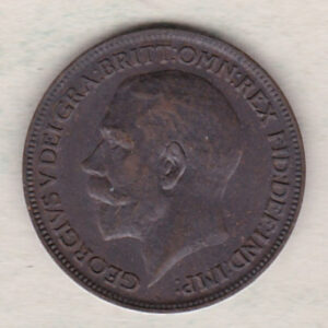 The 1916 farthing was struck in bronze by the Royal Mint. The obverse side of the coin features the uncrowned portrait of King George V facing left, with legend around. The reverse features the seated figure of Britannia facing right, trident in left hand, shield with Union flag in right, the denomination above, and sea behind, with date in exergue.
