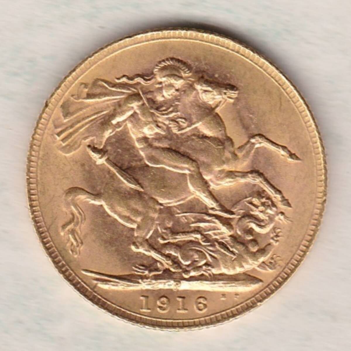 This 1916 sovereign is a coin struck in 22 carat gold in Perth, Australia. The obverse of this coin features the uncrowned portrait of King George V facing left, with legend around. The reverse depicts St. George slaying the dragon, with the date and designer’s initials in exergue. The P – Perth, Australia mintmark can be seen below the horse’s hooves.