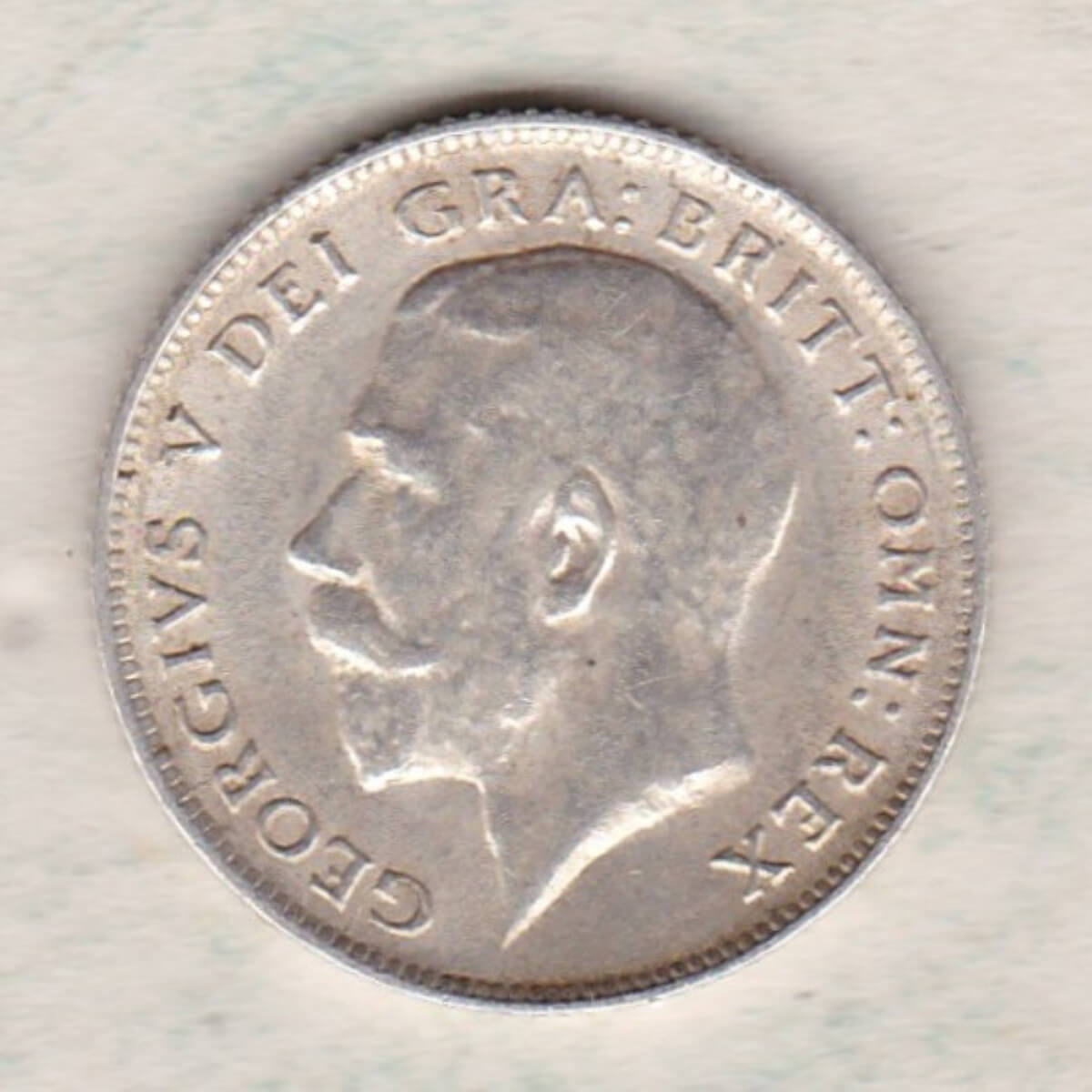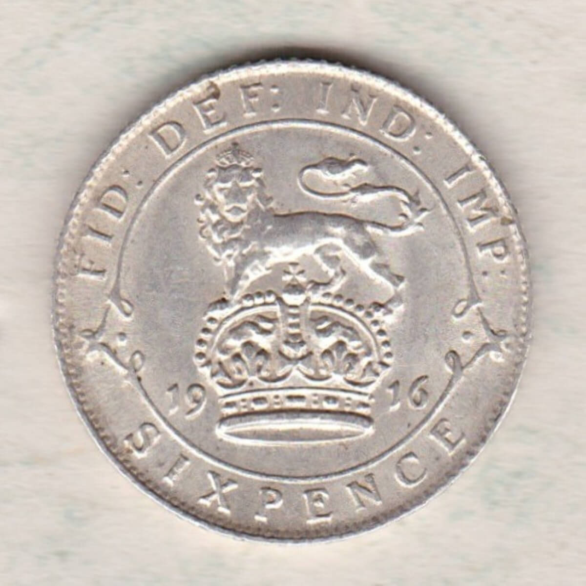The 1916 Sixpence is a coin struck in 0.925 silver by the Royal Mint. This coin features the uncrowned portrait of King George V facing left, with legend around. The reverse features a crowned lion passant atop crown dividing date within circle, with legend above, and denomination below.