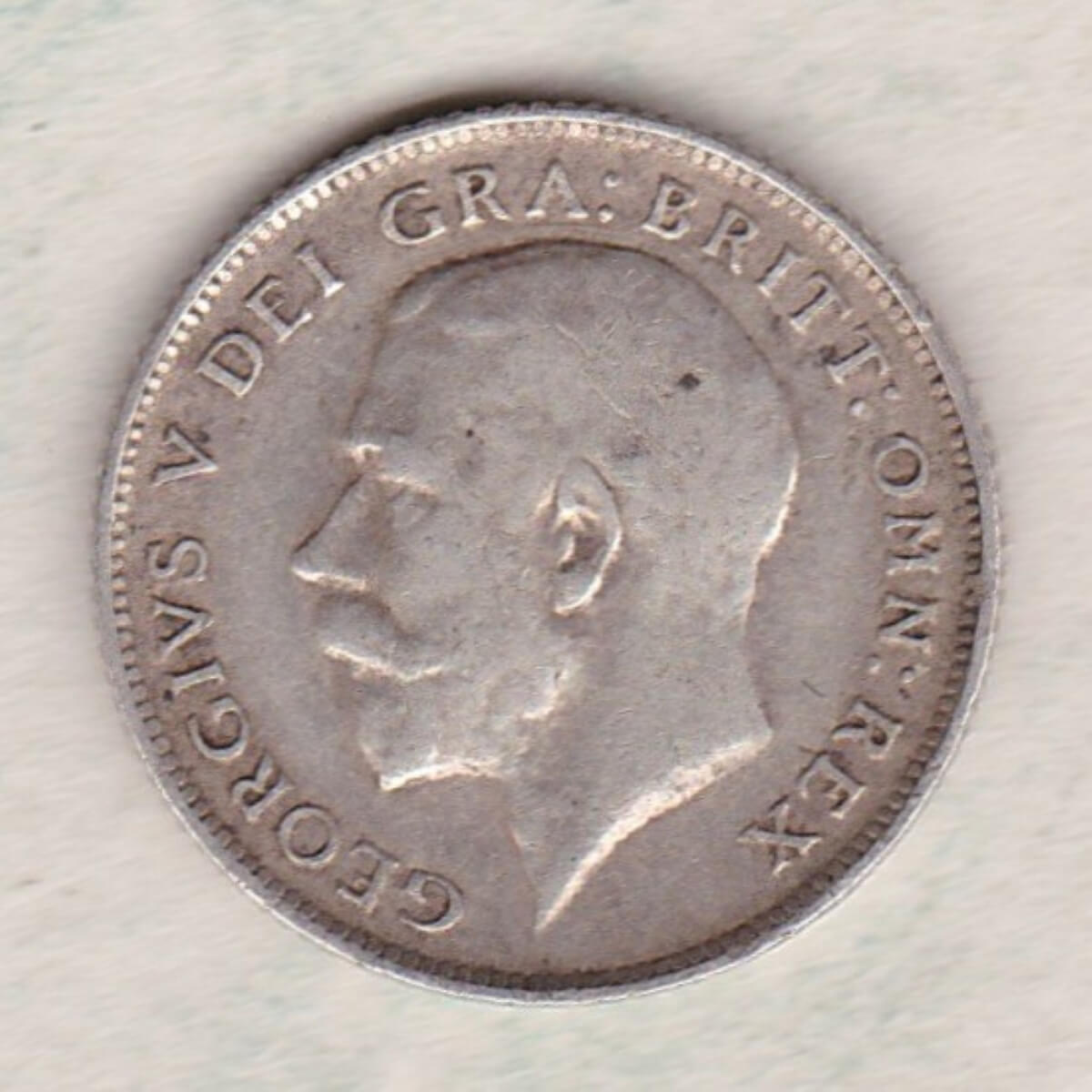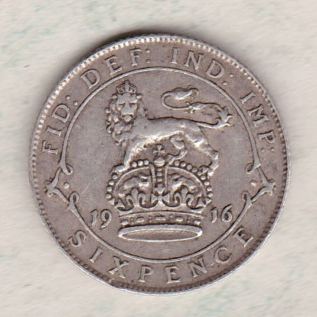 The 1916 Sixpence is a coin struck in 0.925 silver by the Royal Mint. This coin features the uncrowned portrait of King George V facing left, with legend around. The reverse features a crowned lion passant atop crown dividing date within circle, with legend above, and denomination below.
