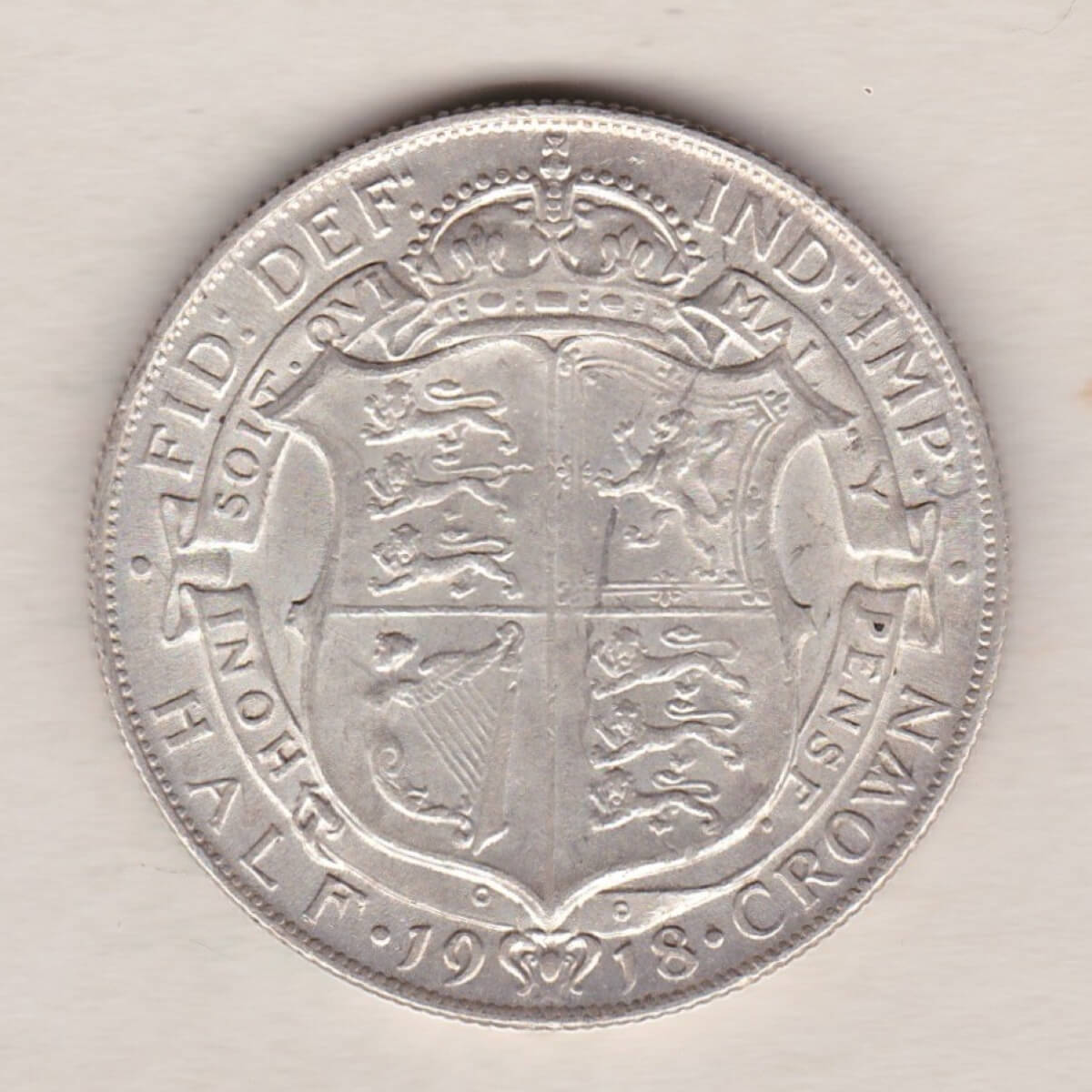 The 1918 Halfrown is a coin struck in 0.925 silver by the Royal Mint.  There is a bare head design of George V on the Obverse.  The Reverse features a crowned quartered shield of arms within a French garter with the motto *HONI SOIT. QVI MAL. Y PENSE.*. The date is located on either side of the garter buckle at the bottom, with HALF to the left and CROWN to the right.