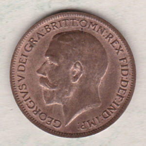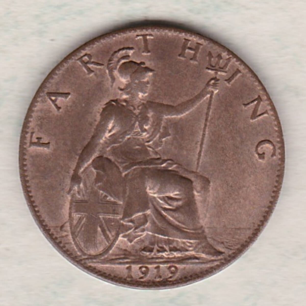 The 1919 farthing was struck in bronze by the Royal Mint. The obverse side of the coin features the uncrowned portrait of King George V facing left, with legend around. The reverse features the seated figure of Britannia facing right, trident in left hand, shield with Union flag in right, the denomination above, and sea behind, with date in exergue.